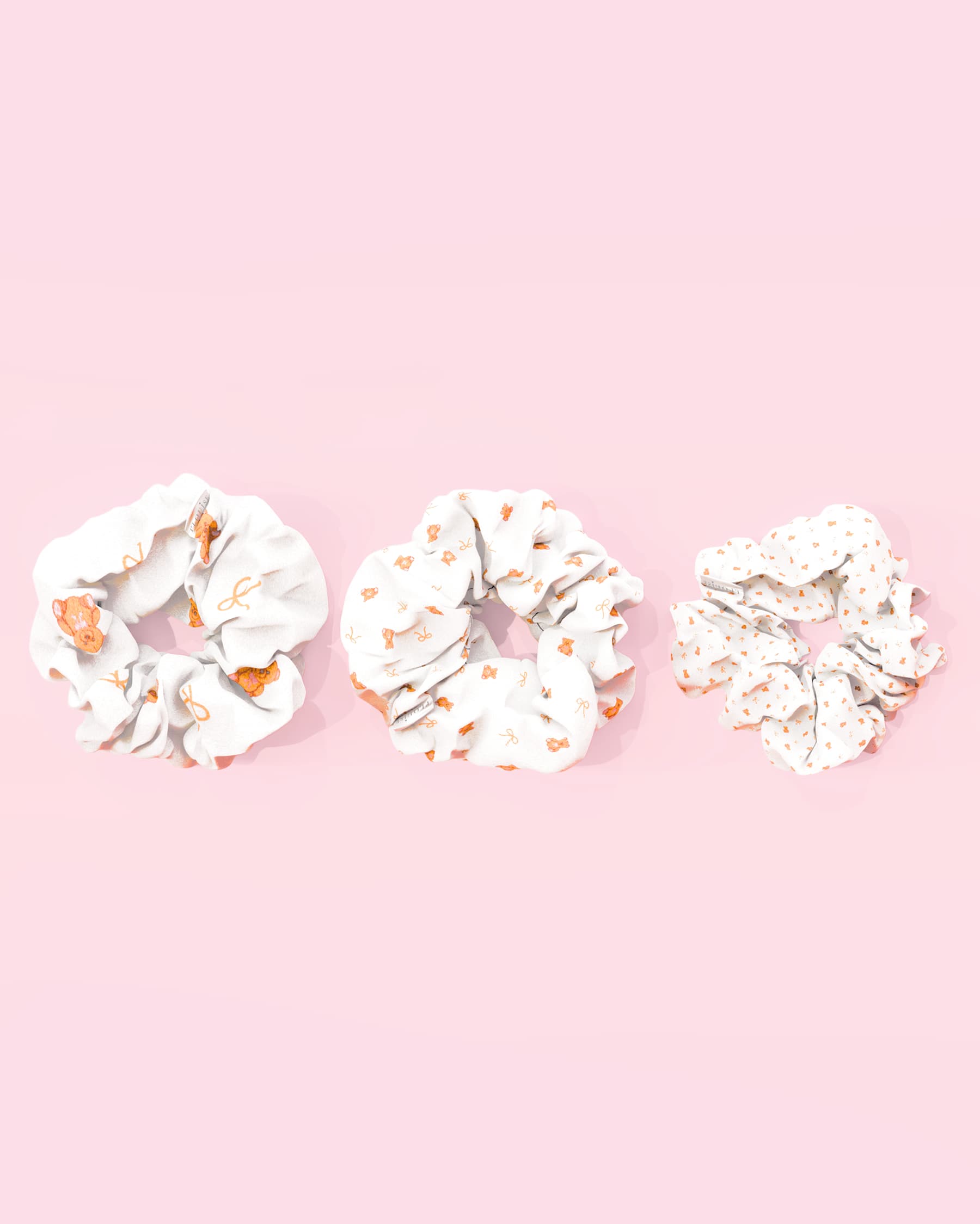 Designed to pair perfectly with the Teddy Touch Collection, this adorable 3-piece scrunchie set features a mix of teddy bear prints on soft, comfortable fabric that feels gentle on your hair - cute, cosy, and crease-free.